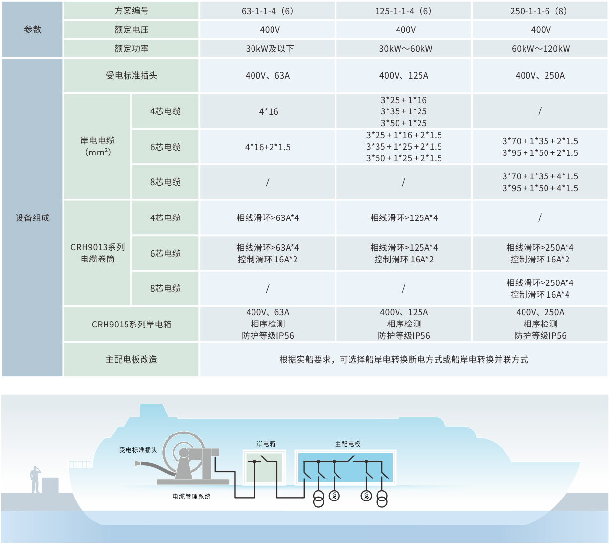 6. 低壓雙卷筒四插頭型船舶岸電受電系統(tǒng)解決方案 方案概述 低壓雙卷筒四插頭型船舶岸電受電系統(tǒng)解決方案為250A級。本方案用于使用岸電容量250kW~500kW的船舶,適用于海進江運輸船。 |
