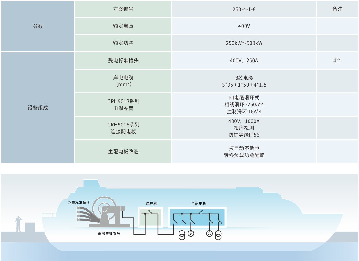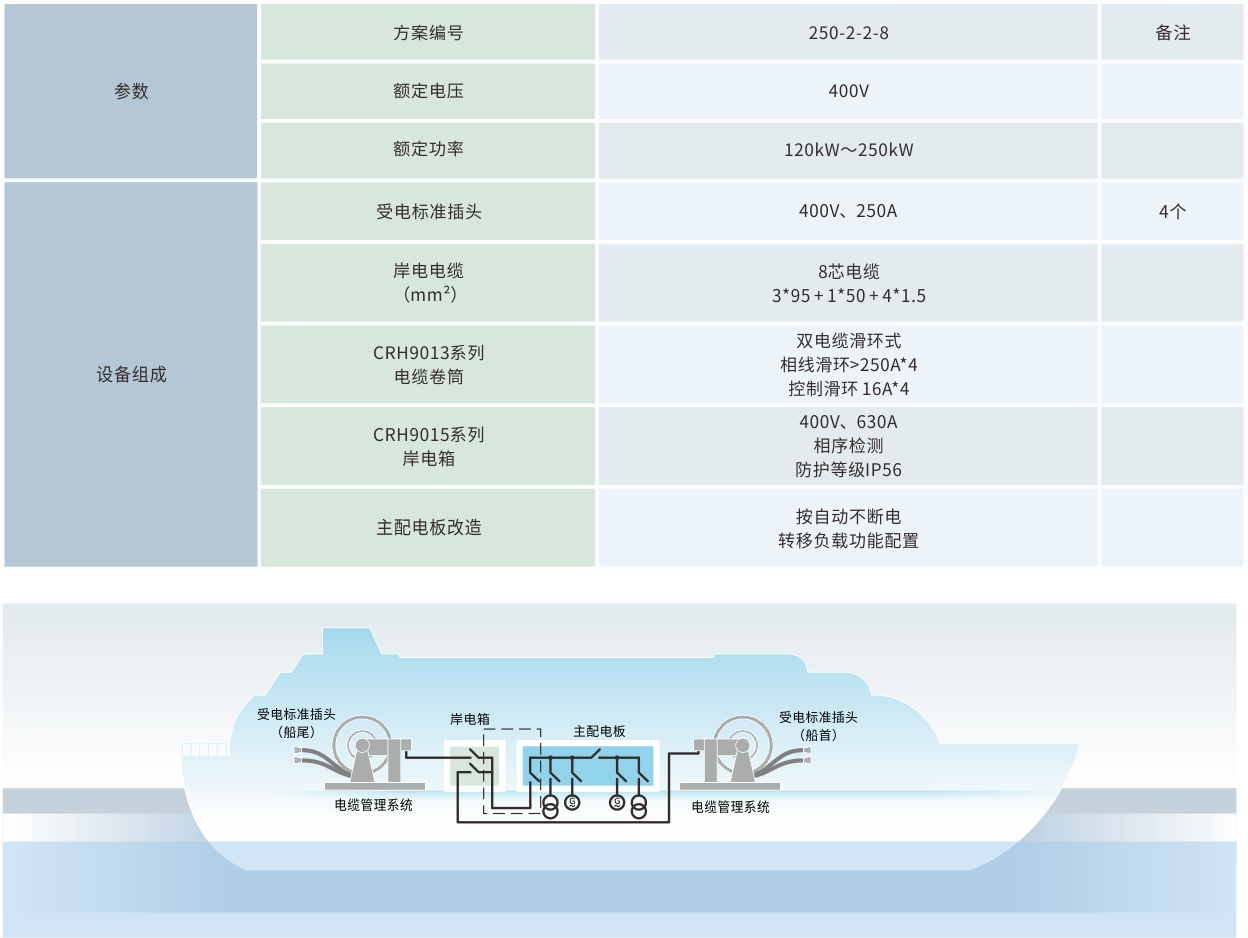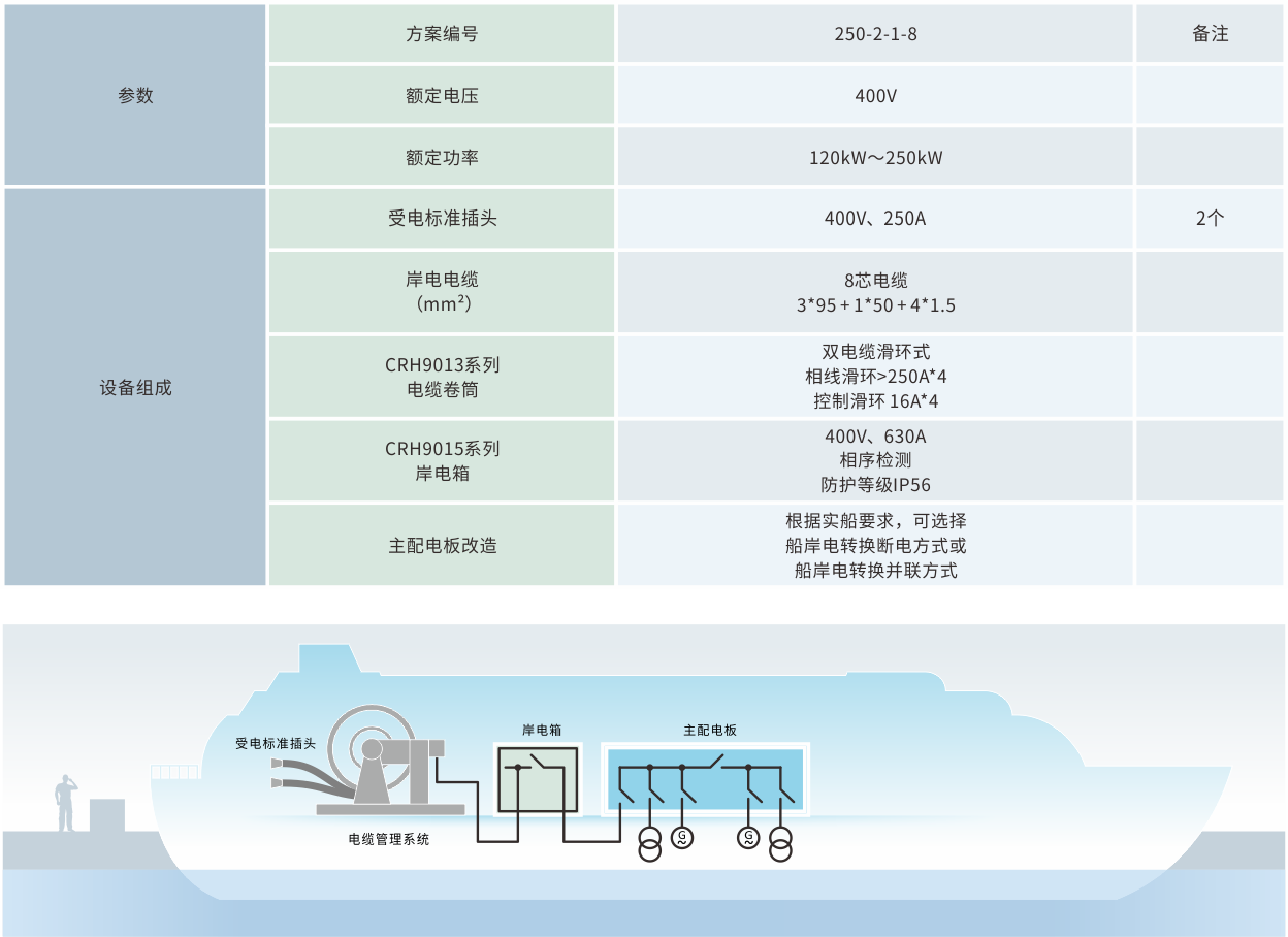 2. 低壓單卷筒雙插頭型船舶岸電受電系統(tǒng)解決方案 方案概述 低壓單卷筒雙插頭型船舶岸電受電系統(tǒng)解決方案為250A級。本方案用于使用岸電容量120kW~250kW的船舶,適用于大型內(nèi)河運輸船和海進江運輸船。 |