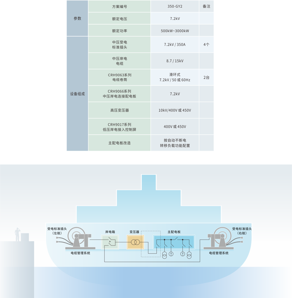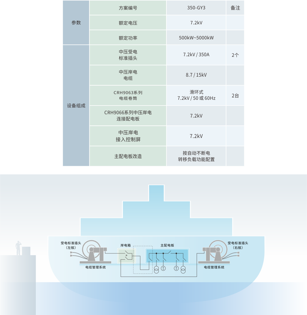 中壓船舶岸電受電系統(tǒng)解決方案主要有雙卷筒單插頭方案、雙卷筒雙插頭方案。中壓船舶岸電受電系統(tǒng)解決方案用于使用岸電容量大于500kW的船舶,適用于大型海進江運輸船或遠(yuǎn)洋運輸船。 |