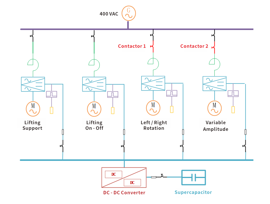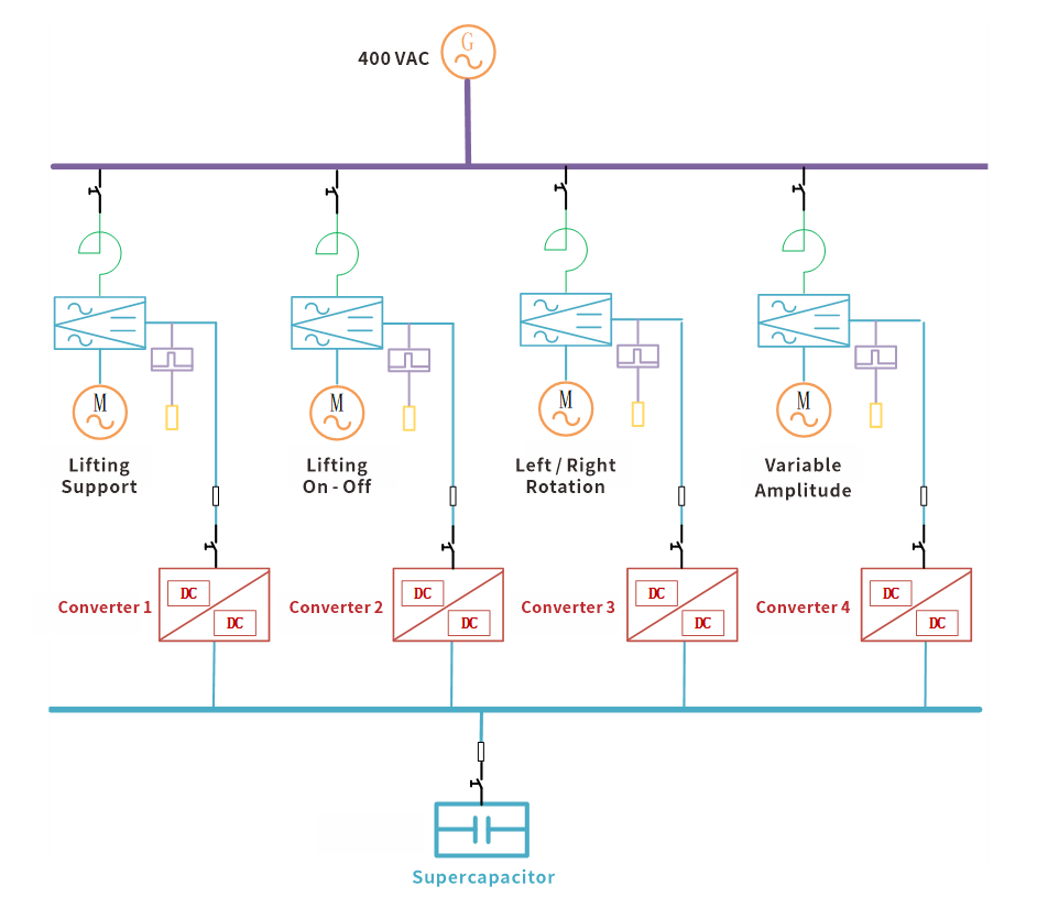 Plan Advantage 1) Using the high power density characteristic of ultracapacitors, it can be charged and discharged quickly, with fast energy recovery speed and high efficiency. 2) The energy is recycled inside the lifting equipment system, and the power saving data is monitored in real time by connecting the Internet of Things interface. The energy consumption of the lifting equipment system is significantly reduced. 3) The device is connected with the DC bus of the lifting equipment system control cabinet, which is simple and convenient. 4) It has bypass protection, high voltage side overvoltage protection, super capacitor overvoltage protection, high voltage side undervoltage protection, super capacitor side undervoltage protection, overheating protection, overcurrent protection and other protection functions.