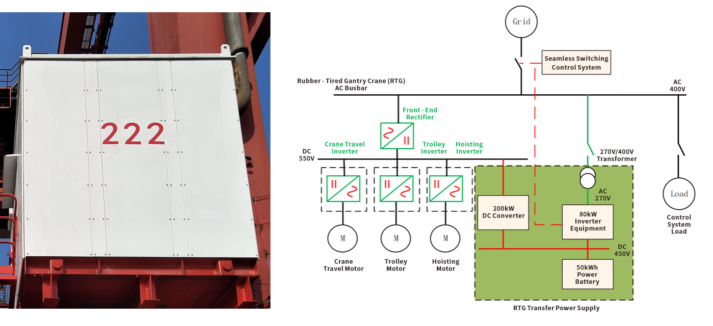 Overview of the Program CRH7112 Series battery transfer system is a kind of specially designed for tire crane energy saving and energy recovery integration system. When the tire crane is transferred, the power battery system supplies power to the tire crane system through the seamless switching control system which provides electricity for the tire crane and connects the power grid at the same time, the DC bus to achieve the energy saving. On the basis of improving the flexibility of tire rotation field, the system improves the economy of energy storage system through potential energy recovery.