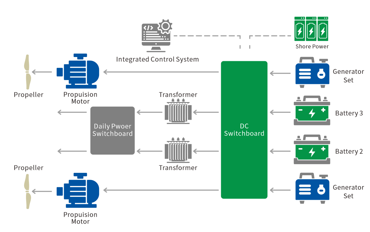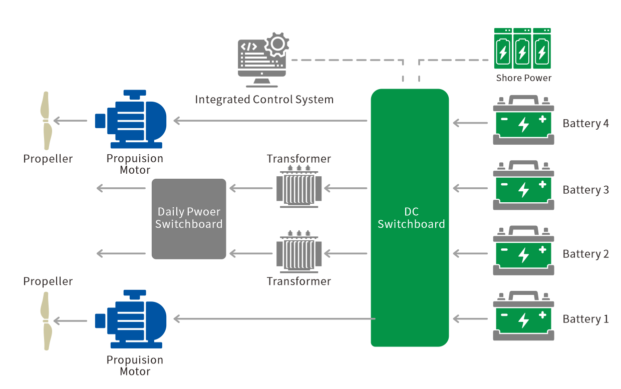 1. Pure Battery-powered Ship Pure battery-powered ships use lithium batteries (or supercapacitors, fuel cells) as the power source and electric propulsion. The equipment composition is simple and reliable and can achieve zero pollution emissions, low vibration, and low noise. The battery (or supercapacitor) is configured according to the ship's endurance requirements.