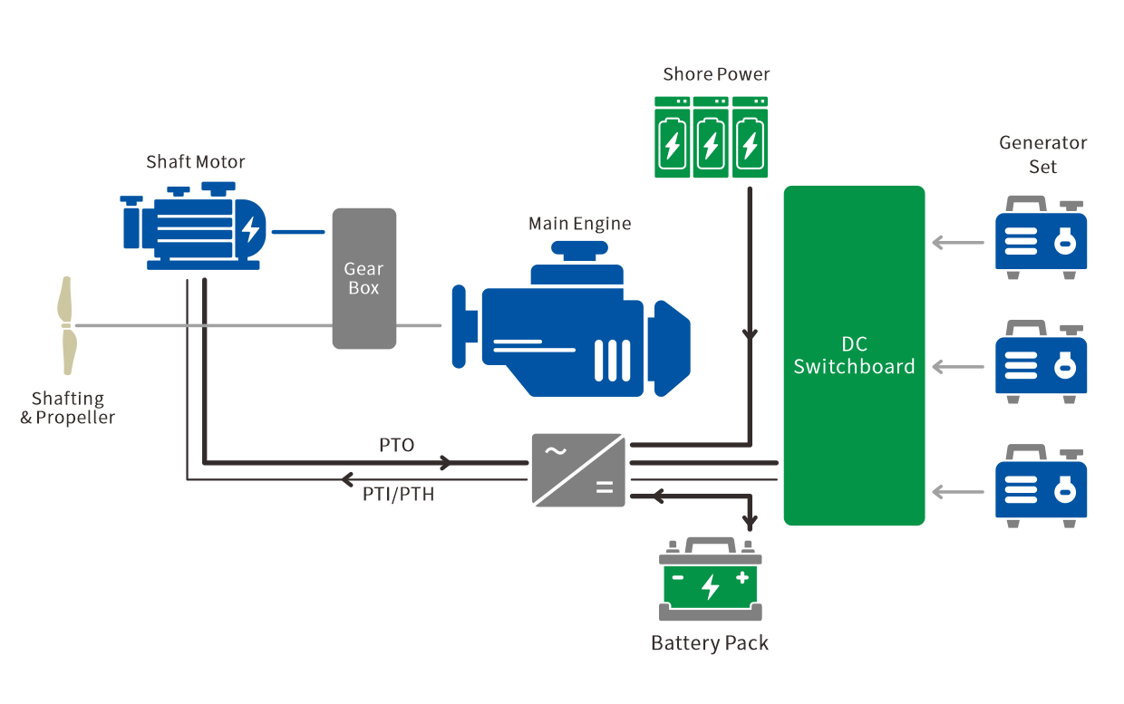 3. Parallel Hybrid Ship Parallel hybrid system uses a shaft reversible motor + main engine driven propeller, which can realize multiple working modes of pure electric propulsion (PTH), shaft power generation (PTO) and hybrid propulsion (PTI). The system has high safety redundancy and part of flight segments are zero-emission.