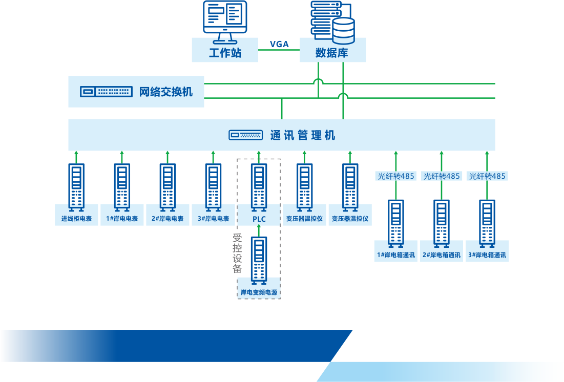 產品特性 1)監(jiān)控功能:顯示當前岸電變頻電源、輸入輸出開關柜、變壓器、高壓限流柜風機或主接觸器、岸電箱等的運行及工作狀態(tài);控制設備的啟停及運行,調節(jié)設備的運行參數(shù)。 2)手動控制功能:在控制整個系統(tǒng)手動運行時,按照手動運行的邏輯,依次合輸入開關柜,啟動變頻電源,合輸出開關柜,并判斷系統(tǒng)反饋狀態(tài)執(zhí)行后續(xù)操作。 3)自動控制功能:在控制整個系統(tǒng)自動運行時,按照自動運行的邏輯,依次合輸入開關柜,啟動變頻電源,合輸出開關柜,并判斷系統(tǒng)反饋狀態(tài)執(zhí)行后續(xù)操作。 4)通訊功能:各通信設備通過RS485通訊接口分別接到通訊管理機上,基于通訊管理機TCP MODBUS協(xié)議實現(xiàn)數(shù)據(jù)通訊傳輸。